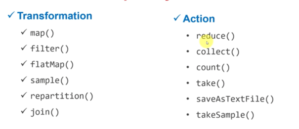 Transformation : RDD üzerinde dönüşümler yapan ve sonucunda başka RDD’ler üreten metodlardır.