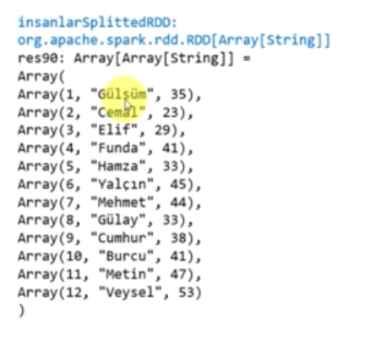 Val insanlarSplittedRDD = insanlarRDD.map(x = > x.split(“,”))