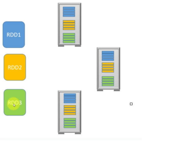 RDD (Resilient Distributed Dataset): Spark’ın temelini oluşturur. Herşey RDD üzerinden dönmektedir. Verilen üç sunucuyu spark cluster’ı olarak düşünelim. RDD1 üç parçaya ayrılmış. Bunu bir tablonun veya büyük bir text tablosunun üçte bir parçası olarak düşünelim.