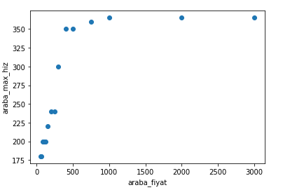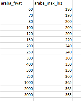 Diyelim ki eliminde araba hızı ve araba fiyatı arasındaki ilişkiyi gösteren bir veri seti olsun.