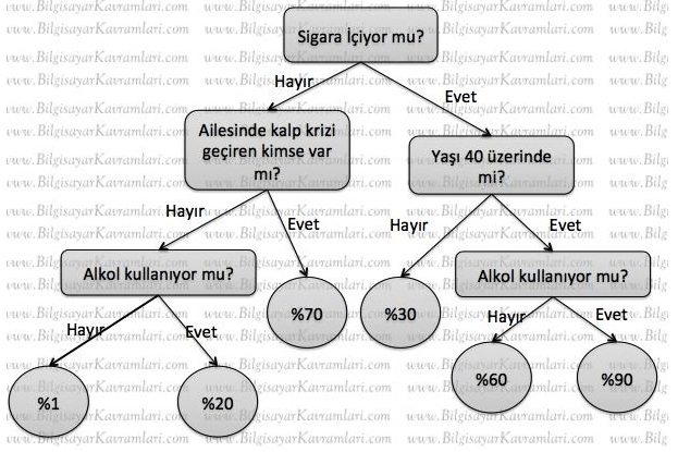 Yukarıda verilen şekilde veri seti dörde ayrılmış. Normalde bu split sayısı ve hangi kısımdan ayrılacağına python decision tree algoritmanın içinde kullanılan information entropy ile karar verilir. Decision tree mantığını anlamak için aşağıdaki öğrenimiş bir ağaç göreseline bakabiliriz. Kalp krizi geçiren kişilerin çeşitli özellikleri ele alınarak veriler üzerinden öğrenilmesi durumunda hayali olarak elde edilecek sonuçlar :