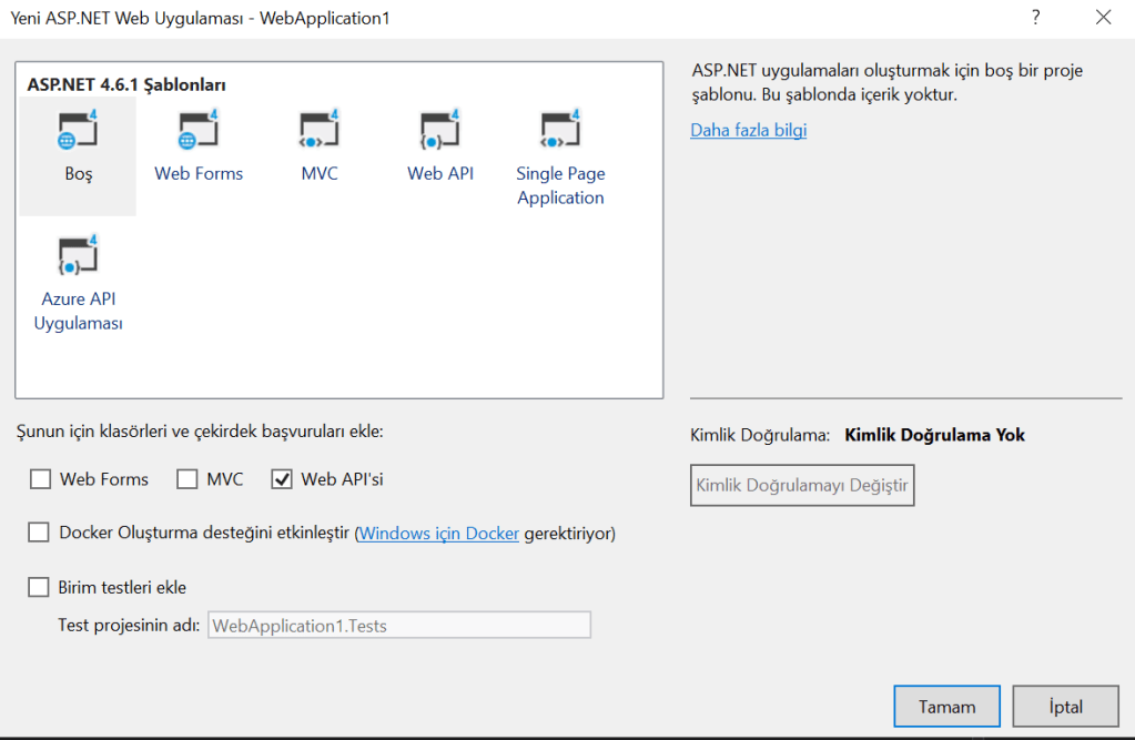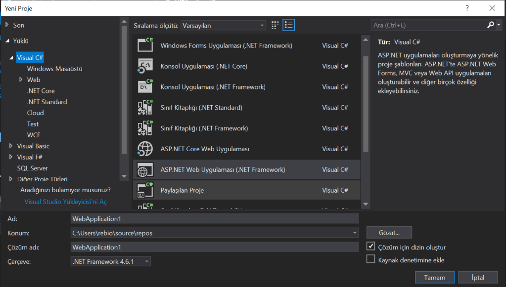 1.) Visual studio ile yeni bir ASP.NET Web Uygulaması oluşturulur.