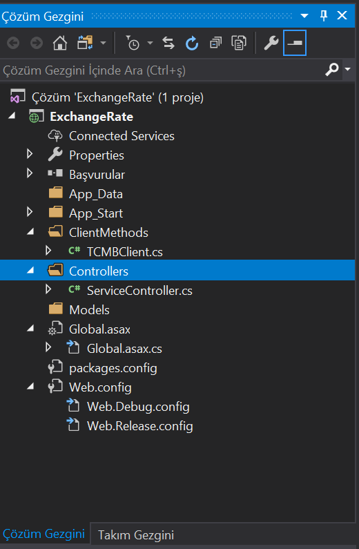 4.)Merkez bankasının web servisine bağlanıp döviz kurları alınacak TCMBClient.cs dosyası metodları oluşturulur.
