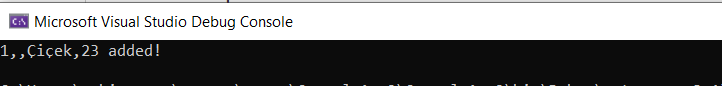 Console.WriteLine("{0},{1},{2},{3} added!",